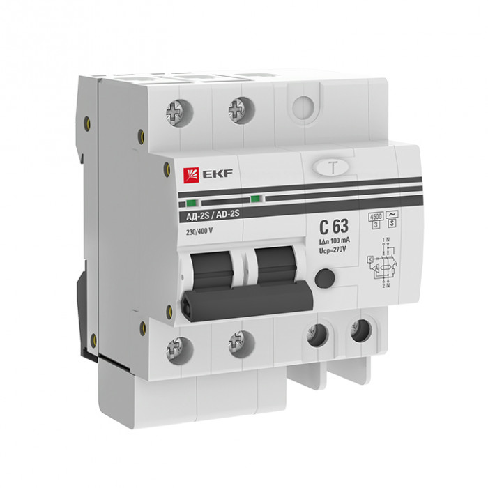 Дифференциальный автомат АД-2 S 63А/100мА (хар. C, AC, электронный, защита 270В) 4,5кА EKF PROxima
