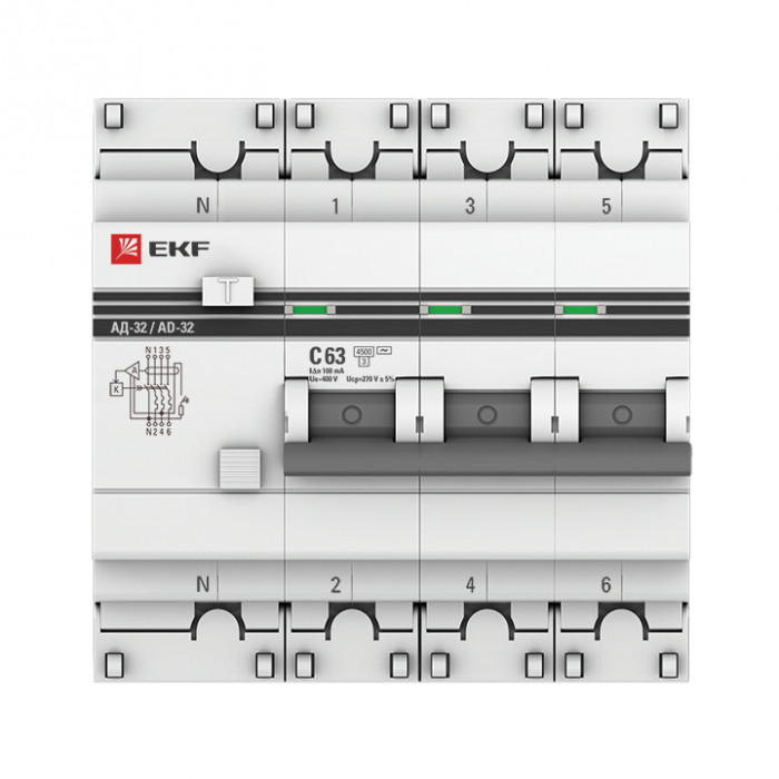 Дифференциальный автомат АД-32 3P+N 63А/100мА (хар. C, AC, электронный, защита 270В) 4,5кА EKF PROxima