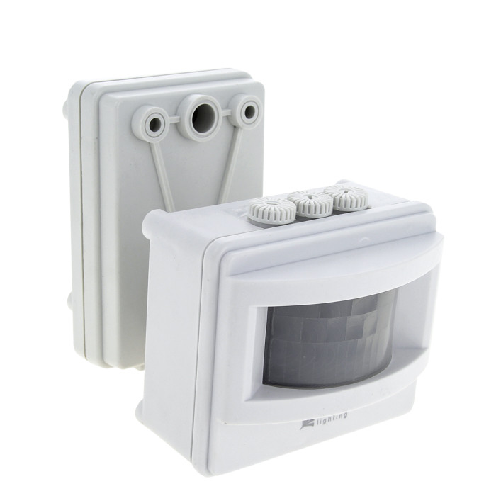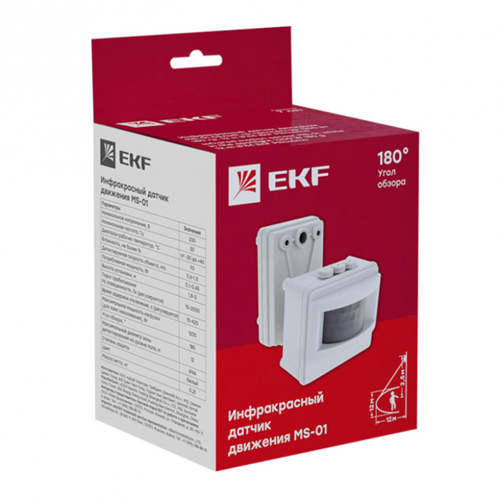 'Датчик движения инфракрасный MS-01 предназначен для экономии электроэнергии за счет автоматического включения/выключения прожектора. Датчик реагирует на движение людей и других объектов в зоне действия сенсора, принцип работы датчика основан на отслеживании уровня ИК-излучения в поле зрения. Датчик MS-01 устанавливается на корпус прожектора с помощью винтов. Сенсор датчика направлен по направлению луча прожектора. Алгоритм работы: при возникновении движения в поле зрения датчика прожектор включается (макс. полная мощность 1200Вт). После этого прожектор остается включенным в течение заданного времени (от 10 сек. до 7 минут, время настраивается) и выключается. Дополнительно датчик имеет функцию контроля освещенности. Если освещенность в зоне детекции выше заданного уровня (настраивается в диапазоне от 10 до 2000 лк), то прожектор включаться не будет, что позволяет дополнительно экономить электроэнергию в дневное время.'