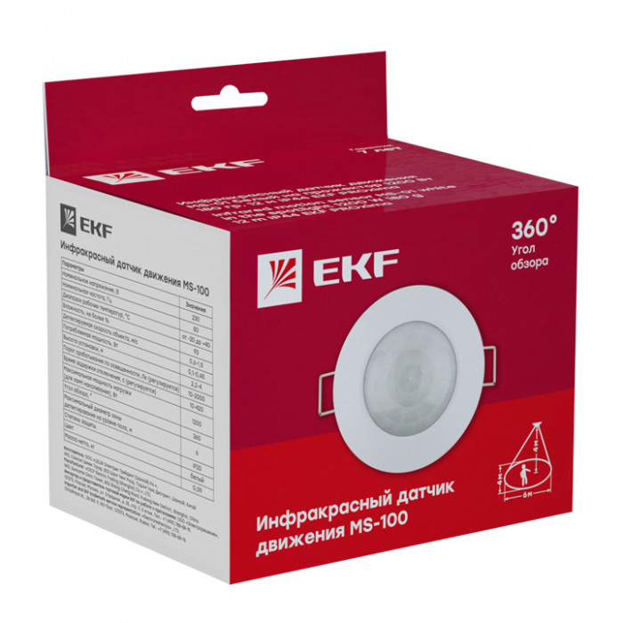 'Датчик движения инфракрасный MS-100 предназначен для экономии электроэнергии за счет автоматического управления освещением и другими инженерными системами. Датчик реагирует на движение людей и других объектов в зоне действия сенсора, принцип работы датчика основан на отслеживании уровня ИК-излучения в поле зрения. Датчик MS-100 предназначен для встраивания в подвесные потолки. Рекомендуется использовать датчик в кладовках, гардеробных и других помещениях с временным пребыванием людей. Алгоритм работы: при возникновении движения в поле зрения датчика встроенное электромеханическое реле (рассчитано на полную мощность 1200Вт) коммутирует подключенную нагрузку. После этого нагрузка находится под напряжением в течение заданного времени (от 10 сек. до 7 минут, время настраивается) и выключается. Дополнительно датчик имеет функцию контроля освещенности. Если освещенность в зоне детекции выше заданного уровня (настраивается), то нагрузка включаться не будет, что позволяет дополнительно экономить электроэнегию днем.'