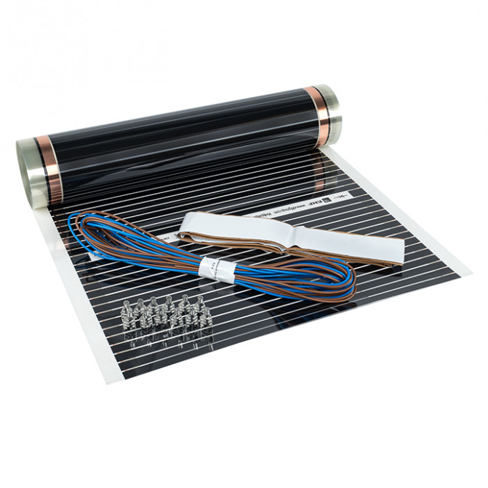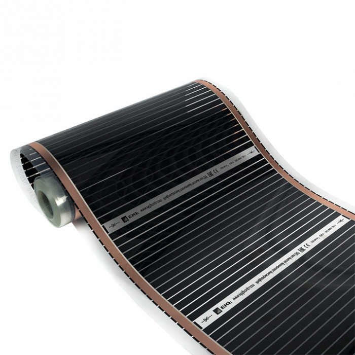Инфракрасный пленочный теплый пол состоит из следующих элементов: полосы углеродного материала шириной около 1,5 см соединены между собой при помощи медных шин с серебряным покрытием, которые и проводят электрический ток. Нагревательный элемент заламинирован с двух сторон плотным полимером, который не задерживает инфракрасное излучение и обеспечивает отличную защиту от попадания влаги, пробоев и возгорания.