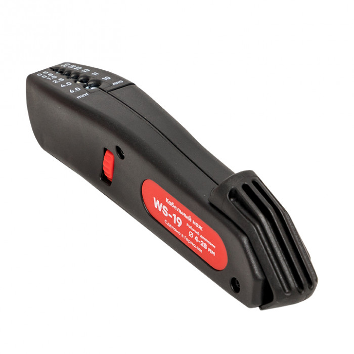 WS-19 кабельный нож с приспособлением для снятия изоляции всех распространенных круглых проводов и кабелей (тонкожильный и массивный кабель в ПВХ изоляции) от 4 до 28мм. Встроенная в корпус изделия функция снятия изоляции с гибких и жестких монтажных проводов поперечным сечением от 0,5 до 6мм.