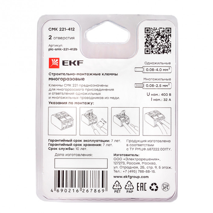 Клеммы СМК предназначены для многоразового присоединения и ответвления одножильных и многожильных проводников из меди (серия 222) или меди и алюминия (серия 224) в электрических цепях переменного тока с частотой 50 Гц напряжением до 400 В.