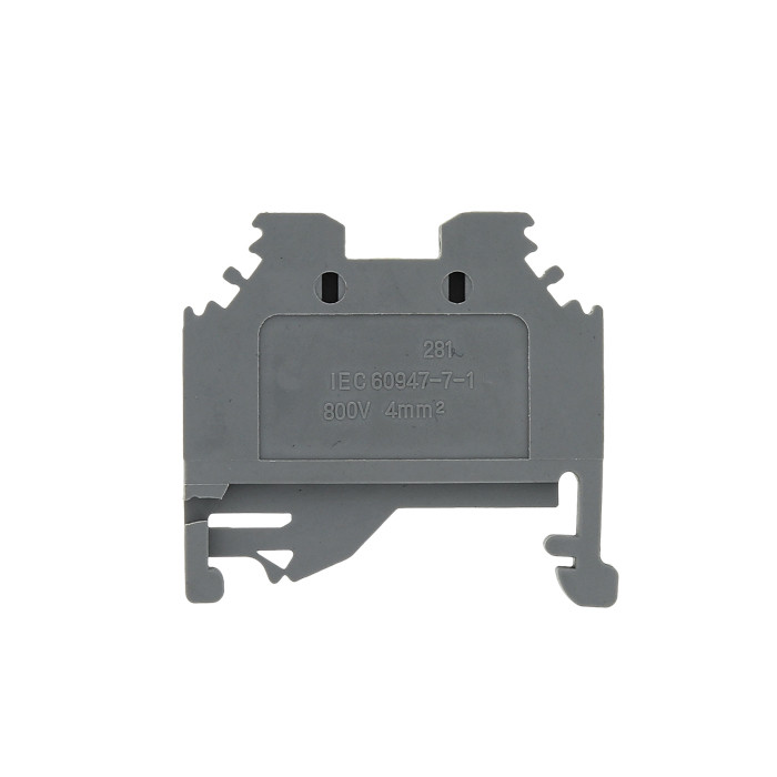 Особое преимущество данных клемм – в безвинтовом креплении проводников: используются подпружиненные самозажимные контакты. Подвод проводника осуществляется сбоку клеммы. Для отсоединения проводника необходимонажать отверткой на пружину через отверстие, расположенное сверху клеммы. Рассчитаны на применение в цепях переменного тока с напряжением до 800 В и частотой 50 Гц. Клеммы изготавливаются из огнестойкого полиамида следующих цветов: серый, синий, желто-зеленый (земля). Дополнительно к клеммам выпускаются боковые заглушки для закрытия контактов конечной клеммы, перемычки для разветвления проводников и др.