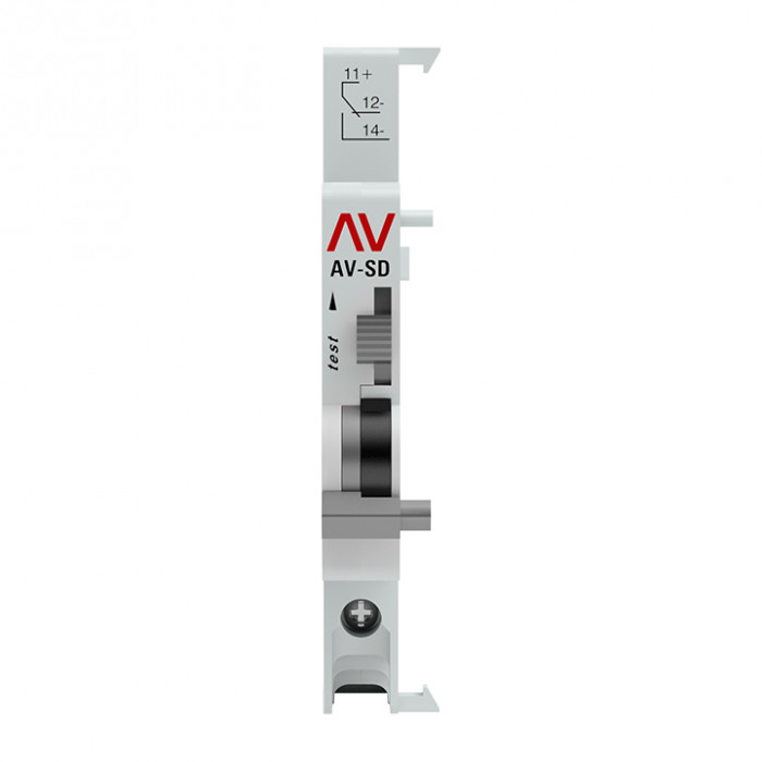 Контакт сигнальный AV-SD устанавливается с левой стороны к AV-6, AV-10, DV, DVA и информирует о срабатывании аппарата, к которому он присоединен, по аварии (КЗ, перегрузка, ток утечки).