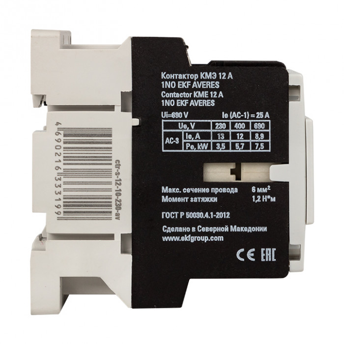 Контакторы КМЭ EKF AVERES состоят из корпуса, закрепленных в нем неподвижных контактов, подвижных контактов, которые закреплены в подвижной части магнитной системы. Неподвижная часть магнитной системы закреплена жестко в корпусе КМЭ. Пружина препятствует смыканию контактов. При подаче напряжения на катушку управления в магнитной системе контактора возникает магнитное поле, которое, преодолевая сопротивление пружины, смыкает магнитную систему и замыкает контакты. При отключении напряжения с катушки управления пружина размыкает контакты. Возможна коммутация алюминиевым и медным проводом.