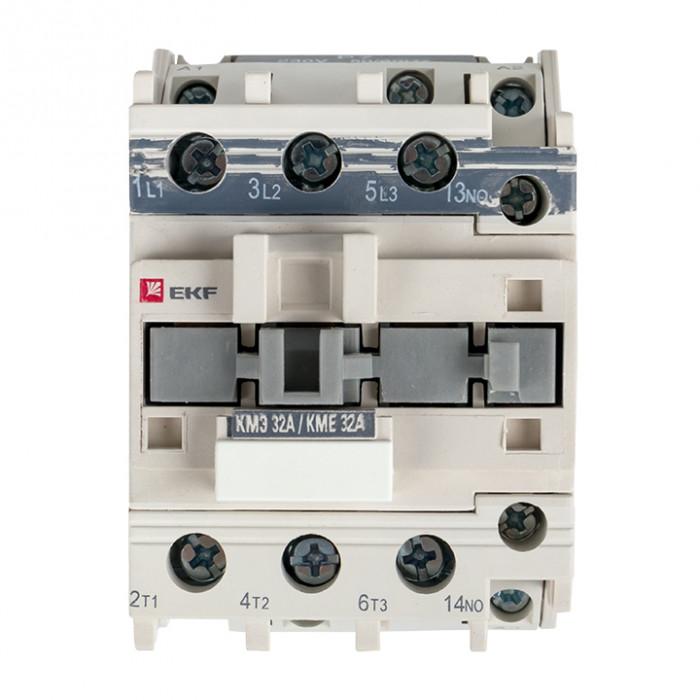 Контакторы КМЭ EKF PROxima состоят из корпуса, закрепленных в нем неподвижных контактов, подвижных контактов, которые закреплены в подвижной части магнитной системы. Неподвижная часть магнитной системы закреплена жестко в корпусе КМЭ. Пружина препятствует смыканию контактов. При подаче напряжения на катушку управления в магнитной системе контактора возникает магнитное поле, которое, преодолевая сопротивление пружины, смыкает магнитную систему и замыкает контакты. При отключении напряжения с катушки управления пружина размыкает контакты. Возможна коммутация алюминиевыми медным проводом.