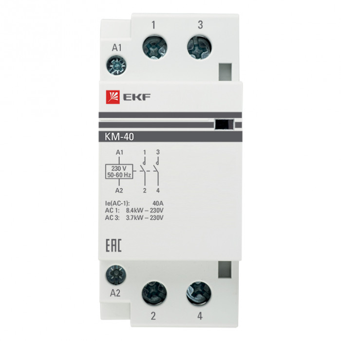 Модульные контакторы представляют из себя контактор в классическом корпусе модульного оборудования. Он состоит из неподвижных контактов, подвижных контактов, которые закреплены в подвижной части магнитной системы. Неподвижная часть магнитной системы закреплена жестко в корпусе КМ. Пружина препятствует смыканию контактов. При подаче напряжения на катушку управления в магнитной системе контактора возникает магнитное поле, которое, преодолевая сопротивление пружины, смыкает магнитную систему и замыкает контакты. При отключении напряжения с катушки управления пружина размыкает контакты. Возможна коммутация алюминиевым и медным проводом.