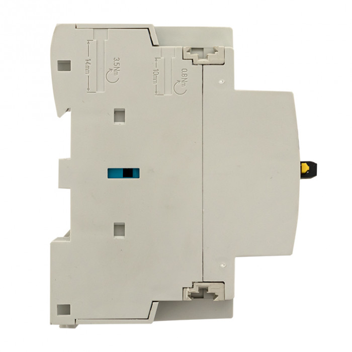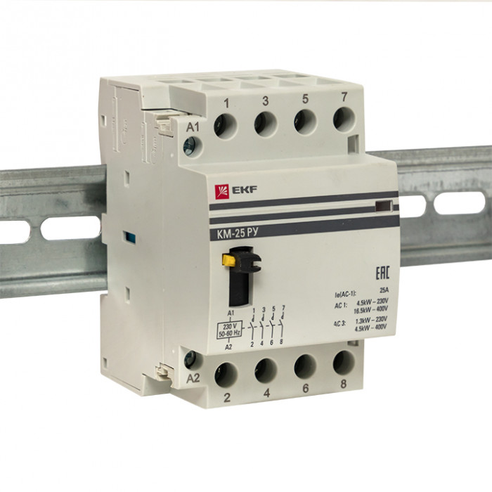 Модульные контакторы представляют из себя контактор в классическом корпусе модульного оборудования. Он состоит из неподвижных контактов, подвижных контактов, которые закреплены в подвижной части магнитной системы. Неподвижная часть магнитной системы закреплена жестко в корпусе КМ. Пружина препятствует смыканию контактов. При подаче напряжения на катушку управления в магнитной системе контактора возникает магнитное поле, которое, преодолевая сопротивление пружины, смыкает магнитную систему и замыкает контакты. При отключении напряжения с катушки управления пружина размыкает контакты. Возможна коммутация алюминиевым и медным проводом.
