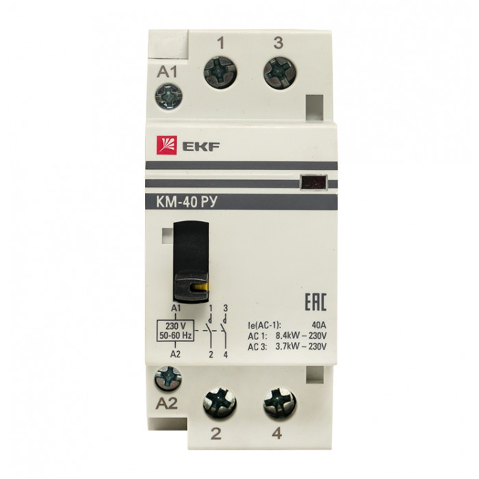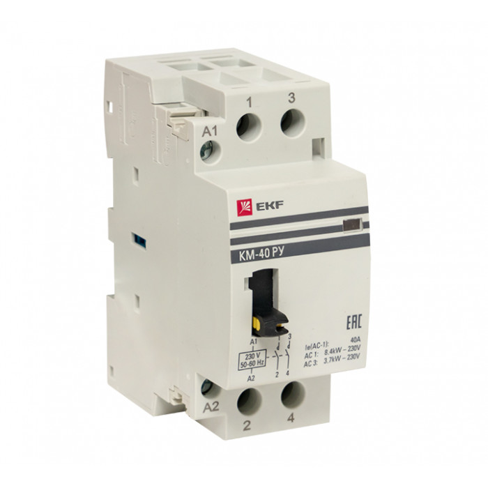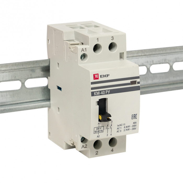 Модульные контакторы представляют из себя контактор в классическом корпусе модульного оборудования. Он состоит из неподвижных контактов, подвижных контактов, которые закреплены в подвижной части магнитной системы. Неподвижная часть магнитной системы закреплена жестко в корпусе КМ. Пружина препятствует смыканию контактов. При подаче напряжения на катушку управления в магнитной системе контактора возникает магнитное поле, которое, преодолевая сопротивление пружины, смыкает магнитную систему и замыкает контакты. При отключении напряжения с катушки управления пружина размыкает контакты. Возможна коммутация алюминиевым и медным проводом.