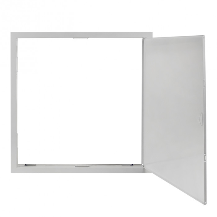 На дверце предусмотрен паз для удобного открывания люка. Закрытие дверцы производится путем фиксации ''шип - паз''. Габаритный размер, указанный в наименовании - это габарит внутренней части люка, монтируемой в нишу.
