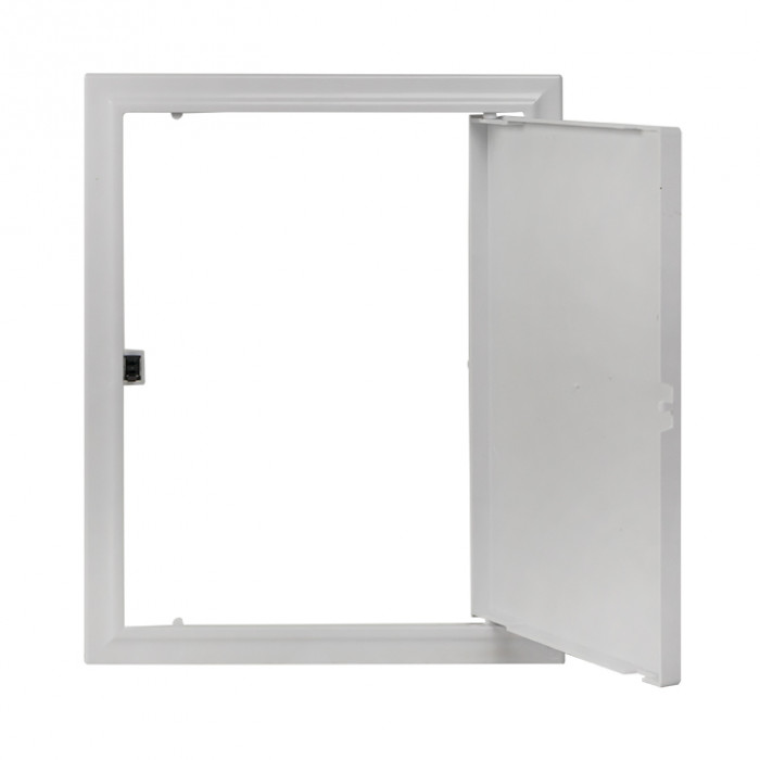 Открытие дверцы производится нажатием на замок. Дверца фиксируется в закрытом состоянии при помощи нажимного замка. Габаритный размер, указанный в наименовании - это габарит внутренней части люка, монтируемой в нишу.