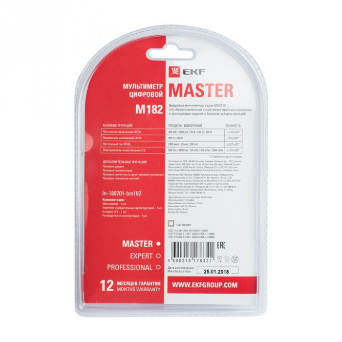 Цифровые мультиметры EKF соответствуют требованиям ГОСТ12.2.091-2012 (IEC 61010-1:2001) в части безопасности приборов и ГОСТ Р 51522.2.1-2011 (МЭК 61326-2-1:2005), ГОСТ Р 51522.2.2-2011 (МЭК 61326-2-2:2005) в части электромагнитной совместимости.