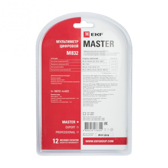 Цифровые мультиметры EKF соответствуют требованиям ГОСТ12.2.091-2012 (IEC 61010-1:2001) в части безопасности приборов и ГОСТ Р 51522.2.1-2011 (МЭК 61326-2-1:2005), ГОСТ Р 51522.2.2-2011 (МЭК 61326-2-2:2005) в части электромагнитной совместимости.