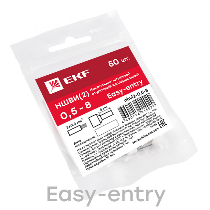 Одинарные и двойные втулочные наконечники (НШвИ и НШвИ2) EKF PROxima являются единственными специально разработанными наконечниками под опрессовку, которые полностью заменяют обязательный процесс облуживания многопроволочных медных проводов (типа ПВ-3, ПВС и т.п.) при монтаже различного электрооборудования. Втулочные наконечники состоят из медной луженой трубки, один конец которой развальцован для облегчения ввода многожильного провода и изолирующей манжеты из полипропилена.