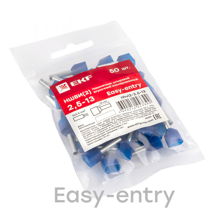 Одинарные и двойные втулочные наконечники (НШвИ и НШвИ2) EKF PROxima являются единственными специально разработанными наконечниками под опрессовку, которые полностью заменяют обязательный процесс облуживания многопроволочных медных проводов (типа ПВ-3, ПВС и т.п.) при монтаже различного электрооборудования. Втулочные наконечники состоят из медной луженой трубки, один конец которой развальцован для облегчения ввода многожильного провода и изолирующей манжеты из полипропилена.