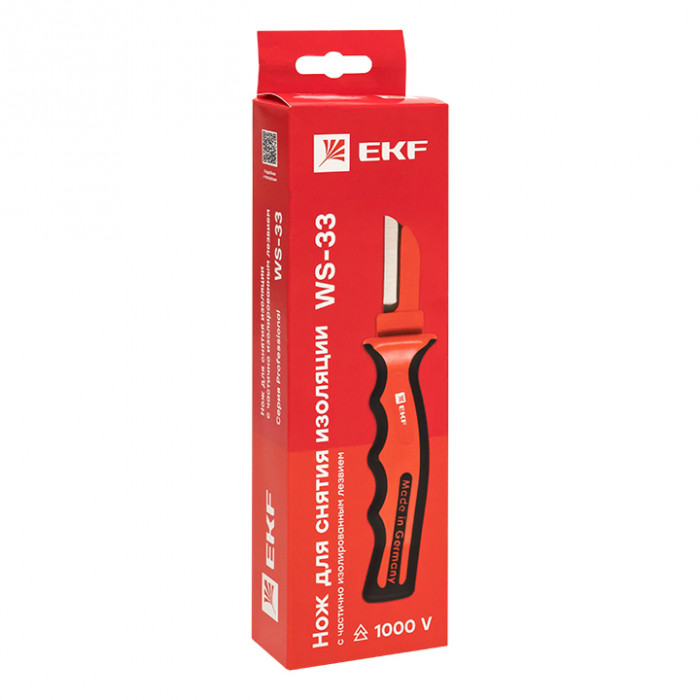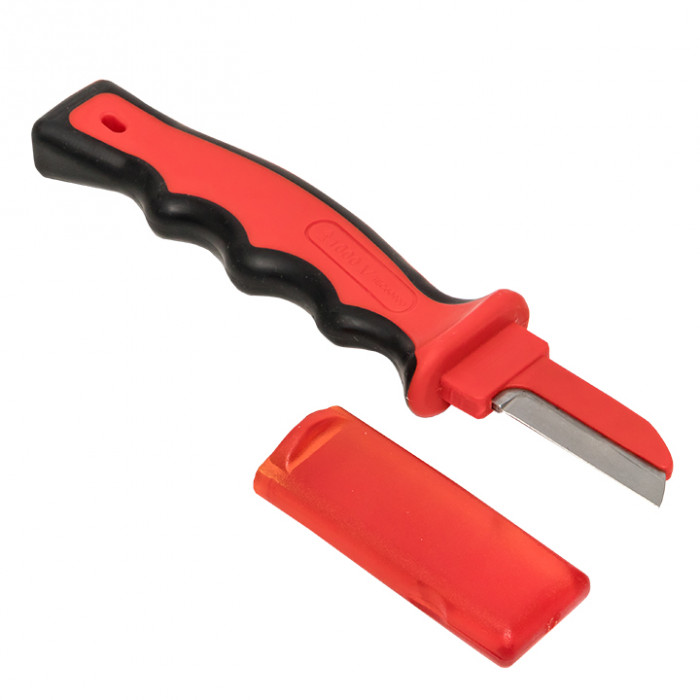 'Соответствует требованиям норм безопасности VDE и пригоден для работ под действующим напряжением до 1000V. Режущее лезвие выполнено из ''золлингеновской'' стали, долго держащей заточку и не подверженой коррозии. Рукоятка выполнена из полиамида, армированного стекловолокном. На ней расположены эргономичные выступы и мягкое покрытие для удобного удержания рукой и возможности приложения бОльшего усилия при снятии изоляции ''на себя''. Гарда на рукоятке, защищающая руку от перескока искры и от соскальзывания в зону резки. Специальный угол заточки режущего лезвия для более легкой работы с кабелем. Изолированное лезвие для защиты от КЗ и увеличиающая жесткость лезвия.'