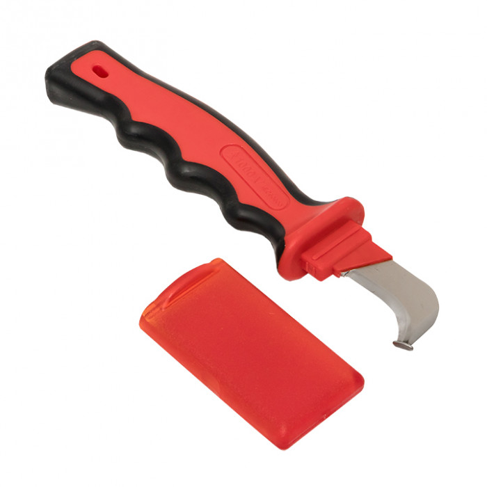 'Соответствует требованиям норм безопасности VDE и пригоден для работ под действующим напряжением до 1000V. Режущее лезвие выполнено из ''золлингеновской'' стали, долго держащей заточку и не подверженой коррозии. Рукоятка выполнена из полиамида, армированного стекловолокном. На ней имеются эргономичные выступы и мягкое покрытие для удобного удержания рукой и возможности приложения бОльшего усилия при снятии изоляции ''на себя''. Гарда на рукоятке .защищающая руку от перескока искры и от соскальзывания зону резки. Специальный угол заточки режущего лезвия для более легкой работы с кабелем. Специальная пятка, предотвращающая повреждение токоведущей жилы и ограничивающая глубину снятия изоляции. Возможность снятия изоляции ''от себя'' и ''на себя''. Снятие наружней оболочки с кабеля и провода.'