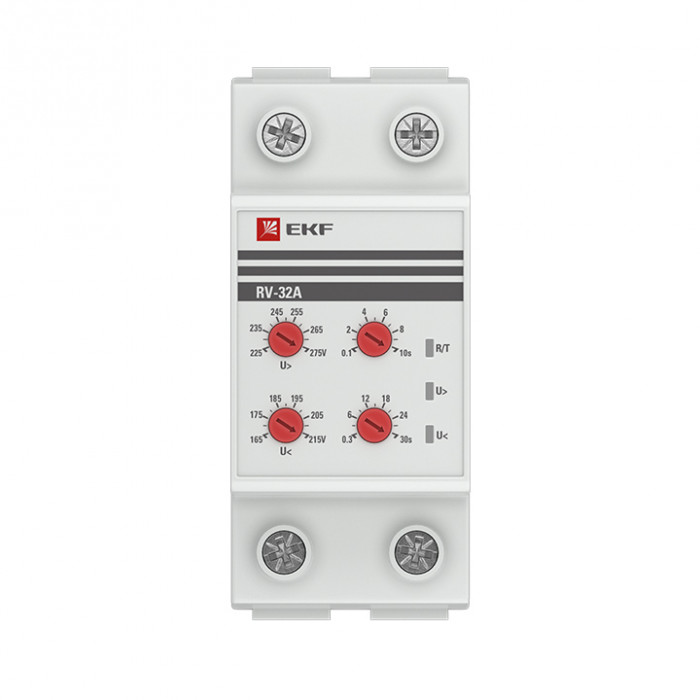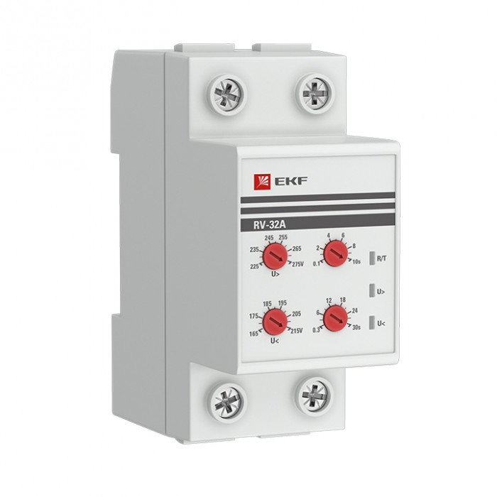 Реле напряжения EKF PROxima являются микропроцессорным устройством и предназначено для постоянного контроля напряжения в однофазных и трехфазных сетях (MRVA-3) переменного тока, для защиты электроустановок от перепадов напряжения. Реле контролирует напряжение в сети в установленном диапазоне и при выходе напряжения за пределы диапазона отключает оборудование от сети электропитания с заданной выдержкой времени. Установка диапазона напряжения и времени срабатывания производится с помощью поворотных регуляторов (RV-5A, RV-32F) либо при помощи кнопок (MRV, MRVA, MRVs) расположенных на лицевой поверхности реле.