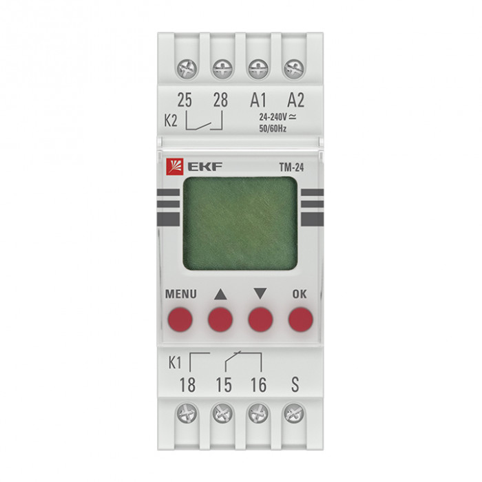 'Таймер многофункциональный ТМ-24 EKF PROxima представляет собой реле с двумя независимыми группами контактов, момент срабатывания которых (включение/отключение) происходит по заданному времени t1 и t2 и выбранной функции (24 функции). Изделие соответствует ГОСТ IEC 60947-1-2014, ГОСТ IEC 60947-5-1-2014. Преимущества: 1.