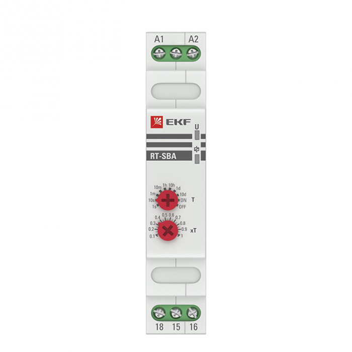 Реле времени RT-SBA EKF PROxima является электронным коммутационным аппаратом с регулируемой установкой времени. Реле предназначено для включения нагрузки с задержкой времени включения. Переключение диапазона времени производится с помощью поворотного регулятора, расположенного на лицевой поверхности реле.