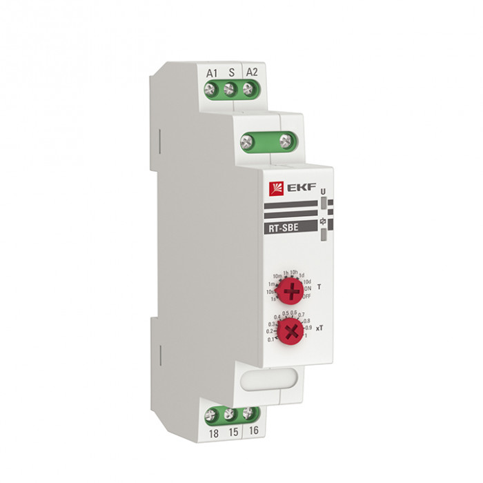 Реле времени RT-SBA EKF PROxima является электронным коммутационным аппаратом с регулируемой установкой времени. Реле предназначено для включения нагрузки с задержкой времени включения. Переключение диапазона времени производится с помощью поворотного регулятора, расположенного на лицевой поверхности реле.