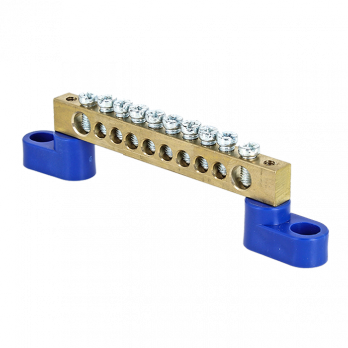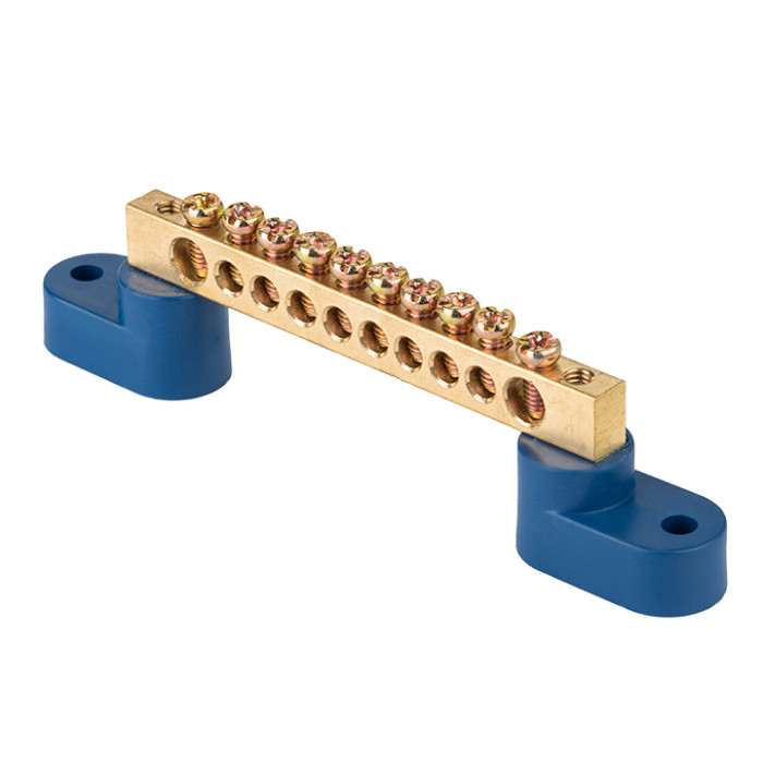 Шина "0" N (6х9мм) 10 отверстий латунь 2 синих угловых изолятора EKF PROxima