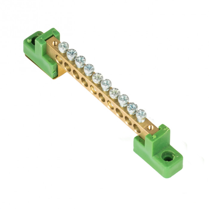Шина "0" PE 6x9мм 10 отверстий латунь с контактной пластиной 2 зелёных угловых изолятора EKF PROxima