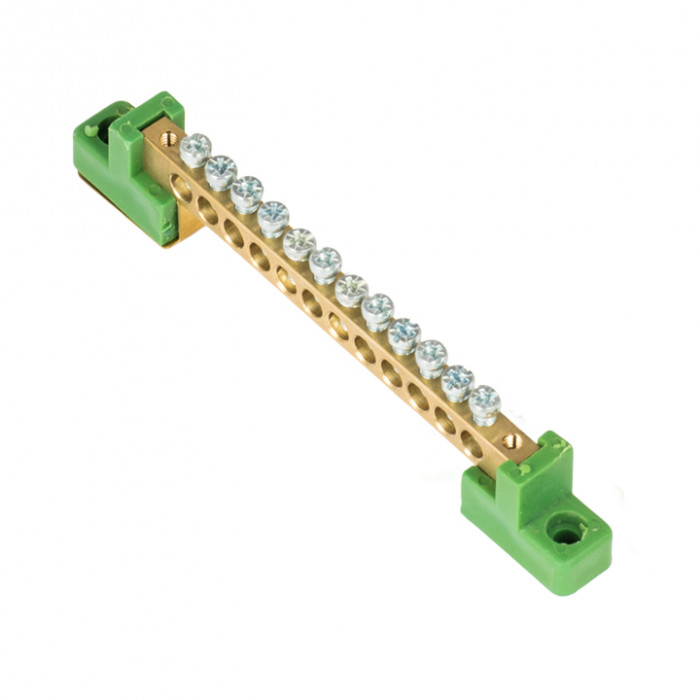 Шина "0" PE 6x9мм 12 отверстий латунь с контактной пластиной 2 зелёных угловых изолятора EKF PROxima