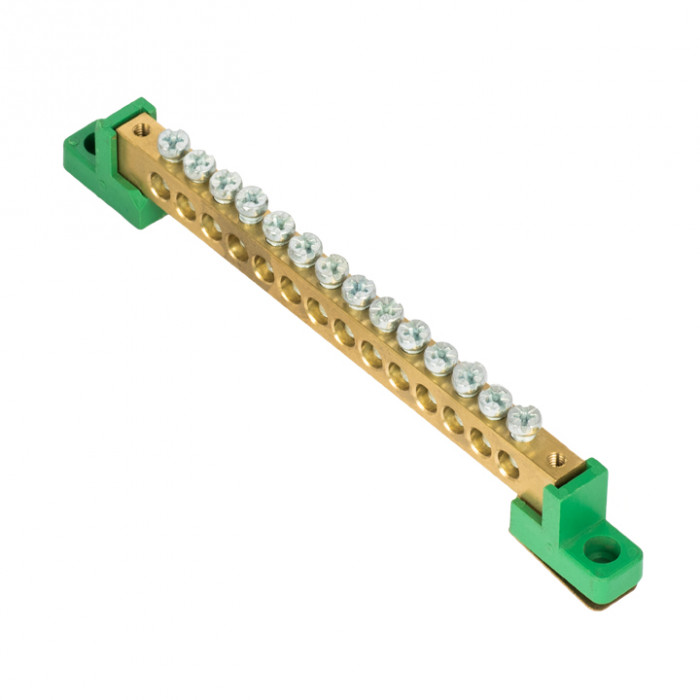 Шина "0" PE 8x12мм 14 отверстий латунь с контактной пластиной 2 зелёных угловых изолятора EKF PROxima
