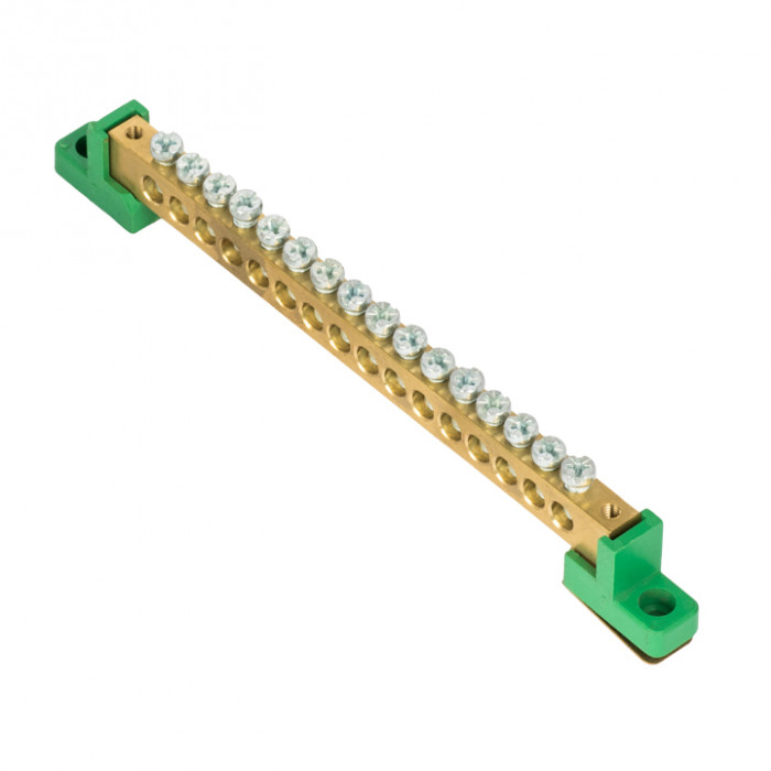 Шина "0" PE 8x12мм 16 отверстий латунь с контактной пластиной 2 зелёных угловых изолятора EKF PROxima
