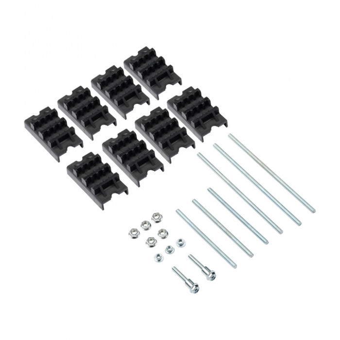 Система наборных шинодержателей позволяет создать требуемую конфигурацию шинодержателя в зависимости от требований проекта. Основанием служит прочный алюминиевый перфорированный профиль, на который насаживаются изоляторы для установки силовых шин ребром. Изоляторы имеют различное исполнение,обеспечивающее возможность установки шин толщиной 5 и 10 мм в количестве от 2-х до 4-х на одну фазу. В составе комплектов идёт необходимый крепёж: гайки, шпильки, винты.