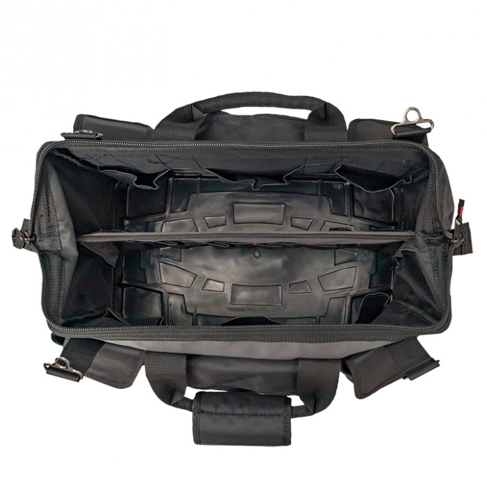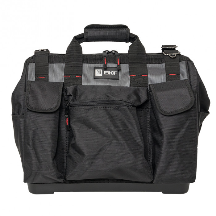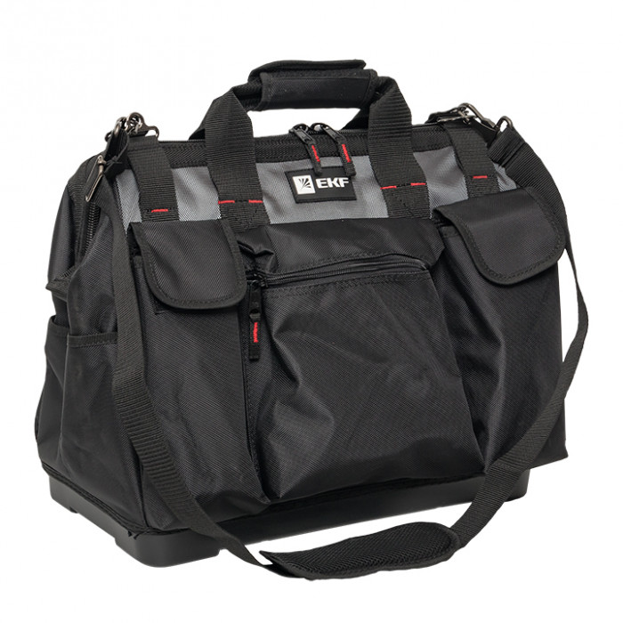 ' Сумка монтажника универсальная с жестким дном С-01 EKF предназначена для переноски и хранения не только ручных инструментов, но и гидравлических прессов и секторных ножниц. Жесткое масло- и водостойкое дно усиленной конструкции, выполнено в соответствии с немецкими стандартами и позволяет выдерживать значительные ударные нагрузки. Внутреннее пространство сумки можно организовывать в соответствии с конкретными задачами благодаря трансформирующейся перегородке. Боковые карманы сконструированы для переноски приборов для измерения тока. Усиленные стальные карабины обеспечивают надёжность при транспортировке тяжелых грузов до 25 кг. Выполнена из материала полиэстер 1680D Оксфорд. Самый качественный материал в настоящее время. Используется в том числе для изготовления экипировки войск спецназа. Благодаря двойному перекрестному шву повышается прочность и износоустойчивость. Унифицированный со всеми моделями ремень с мягким нескользящим наплечником не скатывается с плеча при переноске.'