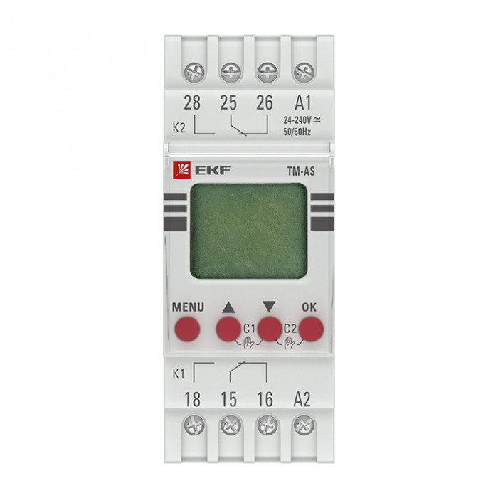'Таймер астрономический TM-AS EKF PROxima представляют собой реле с двумя независимыми группами контактов, момент срабатывания которого (включение/отключение) происходит по времени заката и восхода солнца на основании координат местоположения. Таймер имеет возможность срабатывания (80 программ) по заданному времени и дню недели. Таймер имеет в составе часы, что позволяет отслеживать текущее время. Изделие соответствует ГОСТ IEC 60947-1-2014, ГОСТ IEC 60947-5-1-2014. Преимущества: 1.