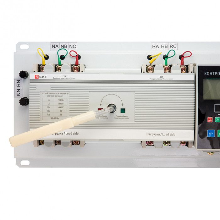 Устройство АВР TCM EKF PROxima предназначено для обеспечения резервным электроснабжением нагрузки, подключенной к системе электроснабжения, имеющей основной и резервный вводы. Устройство АВР автоматически подключает резервную линию питания в случае пропадания напряжения на основной линии. Устройство АВР ТСM EKF PROxima предназначено для обеспечения резервным электроснабжением нагрузки, подключенной к системе электроснабжения, имеющей основной и резервный вводы. Устройство АВР автоматически подключает резервную линию питания в случае пропадания напряжения на основной линии. Также устройство АВР ТСM имеет функцию защиты от токов перегрузки и коротких замыканий распределительных сетей и электродвигателей. Устройство АВР ТСM может быть настроено на несколько программ переключения. А) Питающие линии: электросеть – электросеть: -автоматическое переключение на резервную электрическую линию при выходе параметров основной питающей электрической линии за установленные пределы, автоматический возврат с резервной линии на основную после восстановления параметров основной линии в установленные пределы. Установка времени задержки переключения между электрическими линиями, - автоматическое переключение на вторую электрическую ли-нию при выходе параметров первой питающей электрической линии за установленные пределы, без автоматического воз-врата со второй линии на первую после восстановления пара-метров первой линии в установленные пределы. Переключение на первую линию происходит автоматически после выхода параметров второй питающей электрической линии за установленные пределы. Установка времени задержки переключения между электрическими линиями, - ручное переключение между питающими электрическими линиями. Б) Питающие линии: электросеть – генератор:- автоматическое переключение на резервный генератор линии при выходе параметров основной питающей электрической линии за установленные пределы, автоматический возврат с генератора на основную после восстановления параметров основной линии в установленные пределы. Установка времени задержки переключения между электрическими линиями, - ручное переключение между питающими электрическими линиями. Конструкция и основные функции: Устройство АВР выполнено в виде моноблока и состоит из контактного блока, блока управления и двух силовых автоматических выключателей в литом корпусе. На блоке управления имеется рычаг ручного переключения. Такая конструкция позволяет уменьшить высоту и площадь установки АВР.