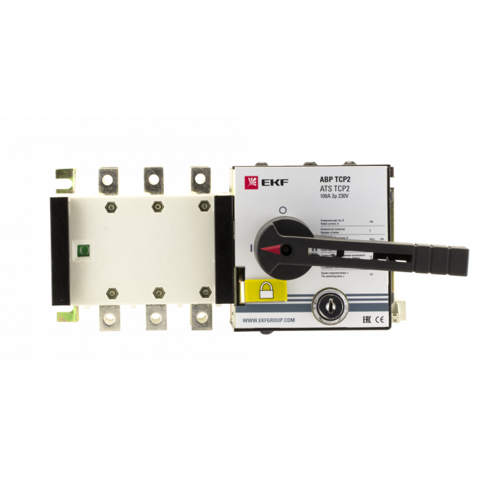 Устройство АВР ТСP1 EKF PROxima выполнено в виде моноблока и состоит из контактного блока и блока управления. На блоке управления имеется рычаг ручного переключения, замковый механизм перевода в ручной или автоматический режимы управления и запорный механизм, обеспечивающий блокировку переключения устройства АВР. Корпус контактного блока выполнен из термостойкой АВС пластмассы. Механизм переключения обеспечивает перемещение контактных групп мостикового типа, которые замыкают цепи или основной линии, или резервной линии, также предусмотрено положение, когда обе линии отключены. В металлическом корпусе блока управления смонтирован электромотор приводной механизм и реле управления. Реле управления запитано от линии L3 основного ввода. При наличии напряжения на линии L3 основного ввода реле управления подает напряжение на электромотор, который обеспечивает замыкание контактных групп основного ввода и отключается концевым выключателем после замыкания главных контактов. Попытка ручного переключения ввода приведет к включению электромотора управления, который вернет питание от основного ввода. При пропадании напряжения на основном вводе реле управления подаст напряжение от резервного ввода на электромотор управления. Работа устройства АВР от резервного ввода аналогична работе устройства АВР от основного ввода. При появлении напряжения на основном вводе устройство АВР автоматически переключится на основной ввод.