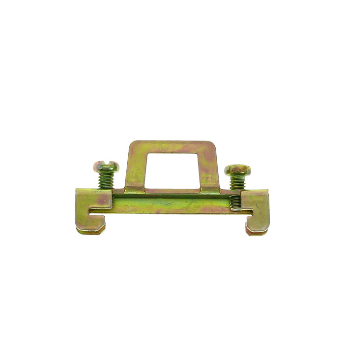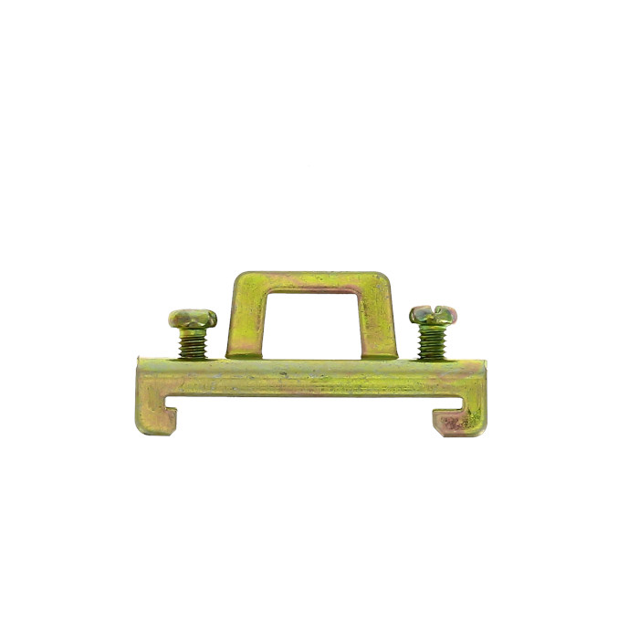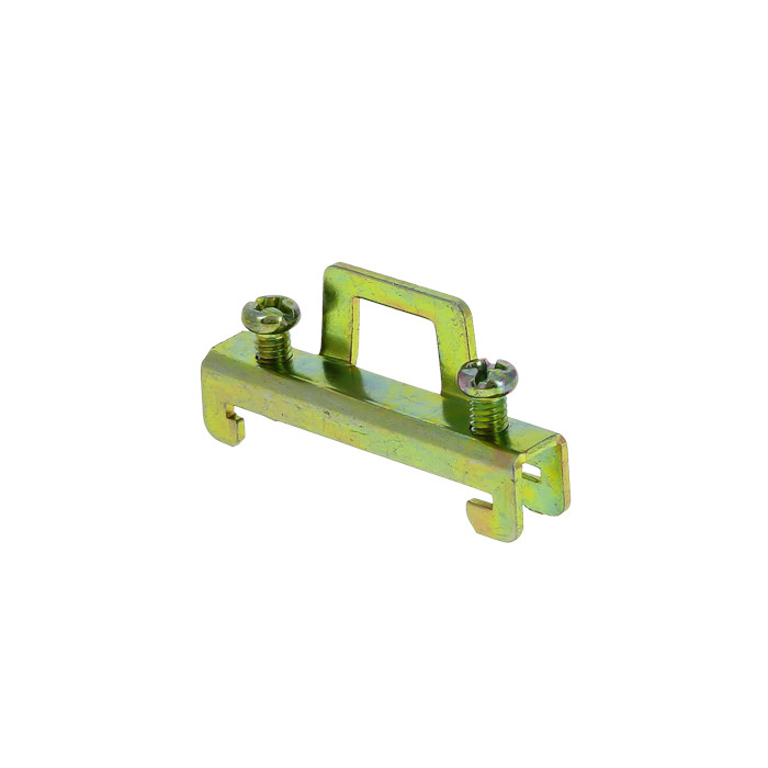 Зажимы применяются для фиксирования модульной аппаратуры и клеммных зажимов на DIN-рейке. Кронштейны для установки DIN-рейки позволяют установить рейку с отступом от монтажной платы, что дает возможность провести провода за DIN-рейкой. Кронштейн для установки DIN-рейки под углом позволяет установить клеммные зажимы под углом, что облегчает подведение к ним проводников. Изготовлены из оцинкованной стали.